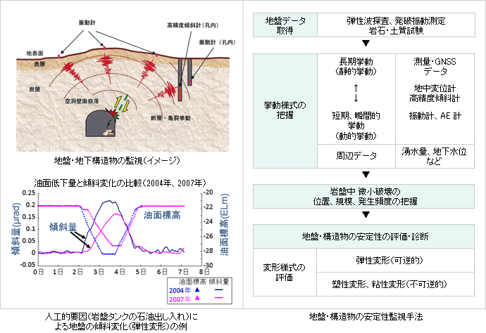 大深度地下の岩盤に建設された諸設備には、直接的な点検・計測・観察ができないものがあります。そのため、例えば、設備の操業(地下岩盤タンクにおける石油などの貯蔵物の出し入れ)や、大規模地震時などに際して、岩盤に異常がないことを遠隔で監視・確認する必要があります。